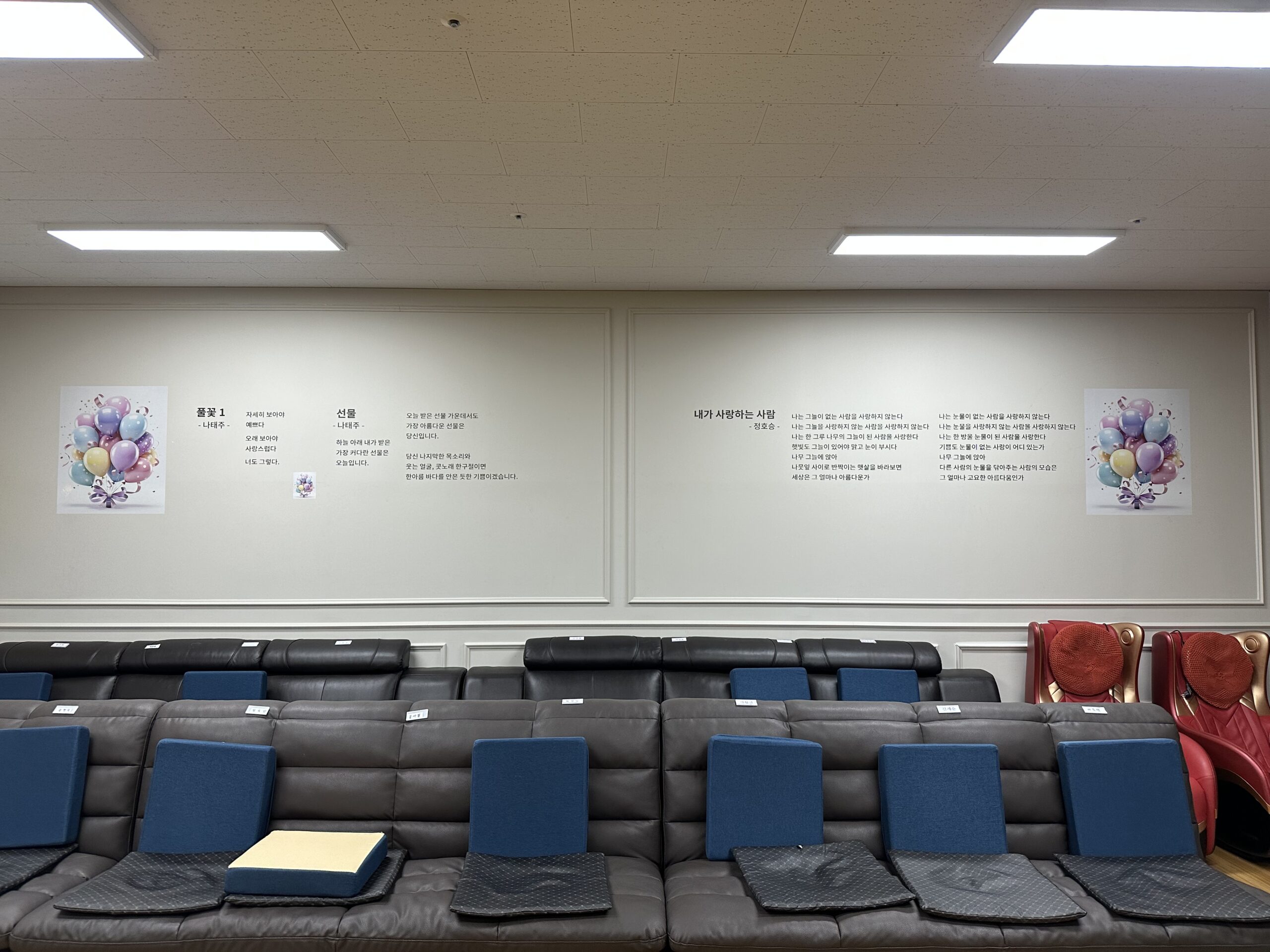 신화아이디는 이 공간에 시와 풍선 이미지를 1층·2층 벽면에 자연스럽게 배치해, 과하지 않으면서도 따뜻한 분위기를 완성했습니다.